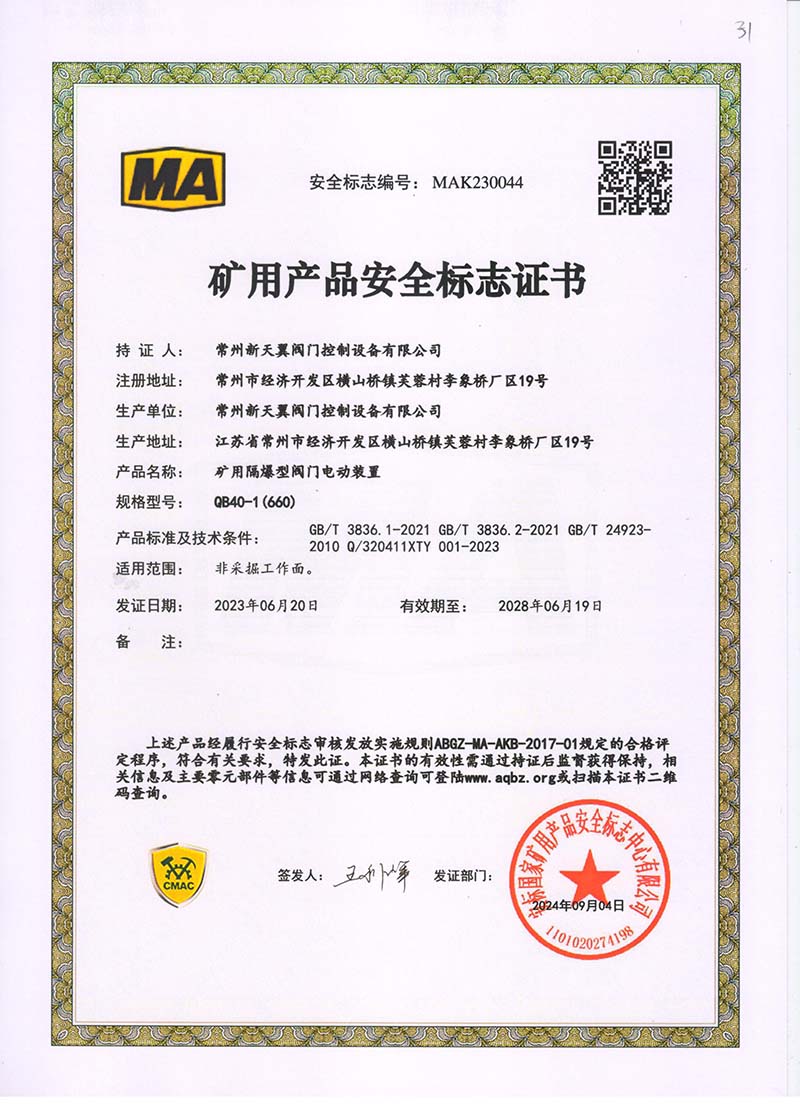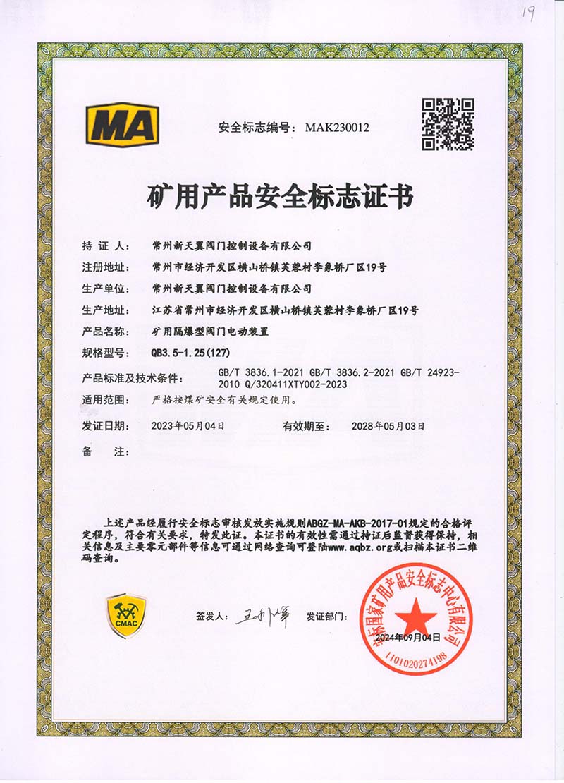 礦用產品安全標志證書QB20-1(380)